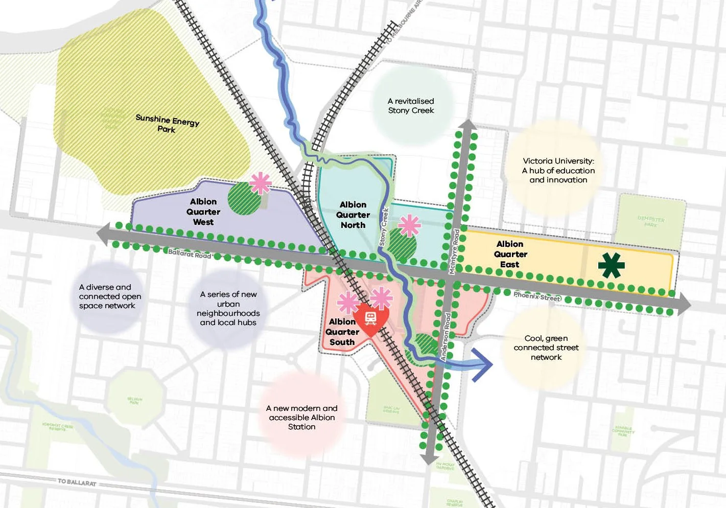 UrbanFold has led the Albion Quarter Structure Plan project a key urban renewal area in the heart of Sunshine in Melbourne’s West. With major infrastructure investment including Melbourne Airport Rail and Albion Station redevelopment the precinct presents an opportunity to transform underutilised industrial land into a high-density knowledge-intensive urban hub.